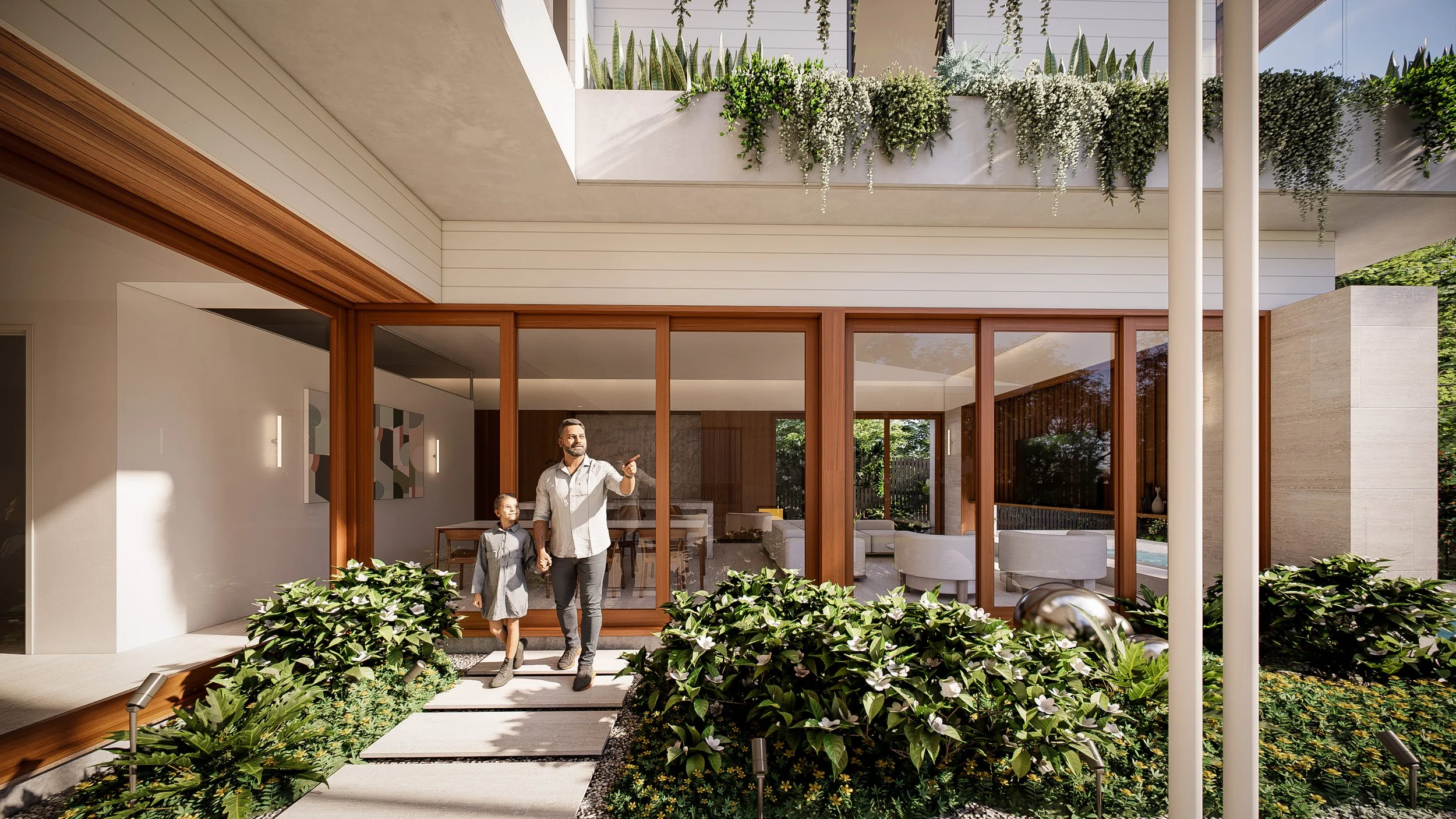 Situated in an affluent inner-city suburb, Akala has been thoughtfully designed to respond to its context and maximise the width of its site. Strong horizontal lines and generous overhangs emphasise the home’s expansive proportions, while finely detailed vertical blades provide solar protection and rhythm to the façade. The recessed upper storey allows the dwelling to nestle comfortably into its surroundings, placing the bluestone cladding, timber elements, and hanging planters prominently in the foreground.